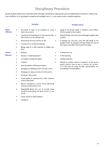 Minor Disruptive in class or on activities on more Speak to the Group Leader or Student Liaison Officer